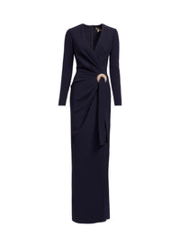 Crystal embellishments add dazzling detail to this long, asymmetrical black dress. Designed with a V-neckline, long sleeves, and cut-outs at the waist, the silhouette flows into a straight skirt with a slit on the left leg. Bold and sophisticated, the design balances contemporary allure with refined evening elegance.