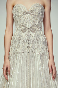 Look 3 embodies quiet sophistication, where every line and embellishment is placed with graceful intention. The fully embroidered strapless gown features a sweetheart neckline and delicate buttons at the back, enhancing its refined silhouette. An embroidered veil with linear detailing and a soft blusher adds subtle structure, while a crescent-shaped beaded headpiece completes the look with an elegant, sculptural touch.