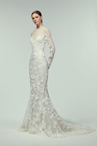 Look 4 captures a sense of sculpted romance, where organic motifs and delicate embellishments bloom in harmony. The fully embroidered long-sleeved mermaid gown features intricate leaf embroidery, 3D flowers, and beadwork that accentuate its graceful silhouette. An embroidered veil with 3D floral appliqué and a soft blusher adds layered softness, while a crescent-shaped headpiece adorned with 3D flower and leaf embroidery completes the look with refined elegance.