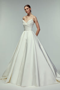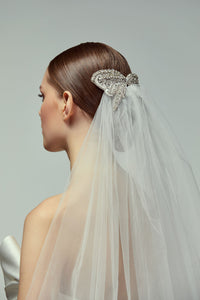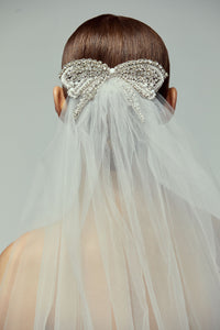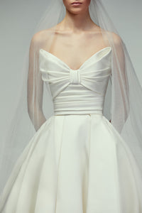 Look 5 expresses timeless femininity through sculptural detail and refined simplicity. The strapless Mikado grand gown features bow-like draping at the bust and a row of buttons down the back, creating a clean yet dramatic silhouette. A tulle veil with a soft blusher adds a whisper of lightness, while a fully beaded headpiece shaped as a bow completes the look with a touch of graceful charm.