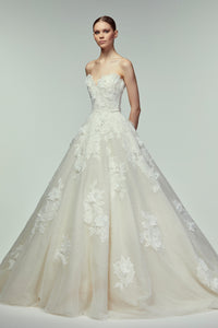 Look 7 embodies refined elegance, where texture and transparency create a soft yet structured impression. The strapless point d’esprit tulle gown features floral guipure lace appliqué and a row of buttons down the back, blending subtle dimension with classic refinement. An embroidered veil with matching floral guipure and a soft blusher completes the look with graceful continuity.