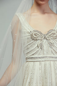 Look 9 brings together structure and softness in perfect harmony, where embellishment and silhouette are thoughtfully composed. The fully embroidered gown features a square neckline, organza ruching, and a beaded bow at the bust, with an open back that adds modern contrast to its intricate detailing. An embroidered veil with a soft blusher completes the look with understated elegance.