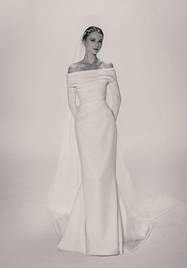 Look 1 captures Elie Saab’s sculptural elegance with a strapless crepe mermaid gown, defined by diagonal draping that gracefully contours the silhouette. A coordinating long-sleeved bolero with dropped shoulders adds structure and softness in equal measure. The look is completed with a sheer tulle veil and blusher, bringing a delicate, romantic finish to the modern composition.