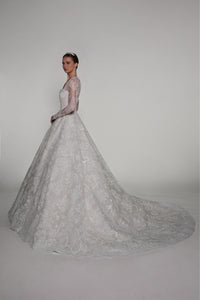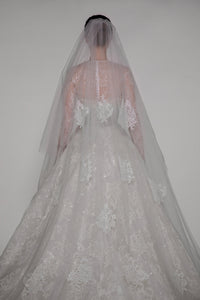 Look 12 captures the quiet shimmer of moonlight on lace, where every movement catches the light in delicate reflection. The strapless sweetheart gown is crafted from Raschel lace, embroidered throughout with transparent sequins that add subtle luminosity. A detachable bolero offers versatile styling, while a tulle veil adorned with lace flowers, a blusher, and comb completes the look with romantic elegance.