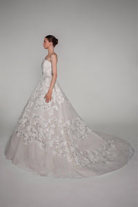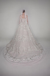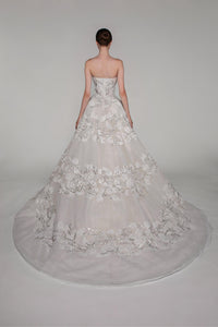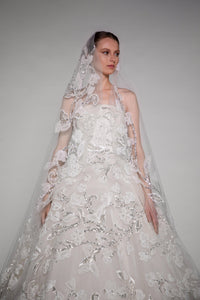 Look 14 evokes the quiet flourish of a winter vine, where silver-touched petals and leaves wind across soft layers in frozen bloom. The strapless gown is adorned with embroidered organza and tulle flowers, silver beads, and vine-like leaves that trail delicately across the silhouette. A long-sleeved embroidered tulle bolero mirrors the gown’s floral detailing, while a circular veil with an embroidered border and comb completes the look with ethereal symmetry.