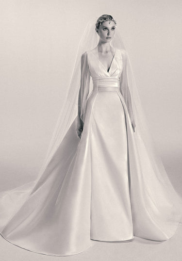 Look 5 reveals the quiet drama of winter in motion, where light brushes against sculpted form and shimmer whispers across still air. The stretch Mikado mermaid gown features a softly draped V-neck and V-back that contour the silhouette with fluid precision. It is styled with a long-sleeved high-neck tulle bolero, embroidered with white sequins, silver flowers, and delicate white pearls. A tulle veil with a blusher completes the look, adding layered softness to this serene composition.