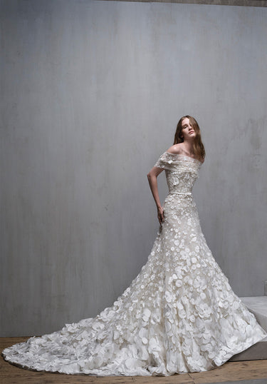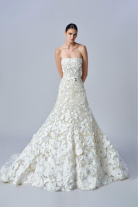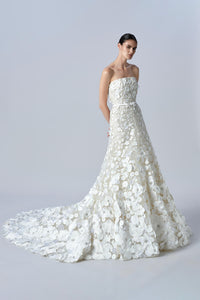 Look 15 reveals a composition of soft romance and refined detail. The strapless gown is fully embroidered with 3D satin and organza flowers and complemented by a removable bolero, blending delicacy with modern versatility.