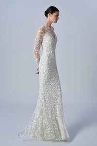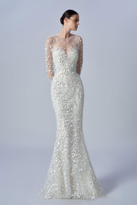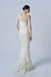 Look 16 captures the strength of form and light. The long-sleeved mermaid gown is fully embroidered and paired with a matching removable overskirt, bringing a sense of regal balance between structure and flow.