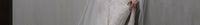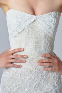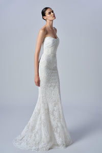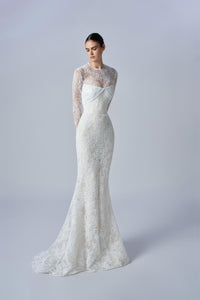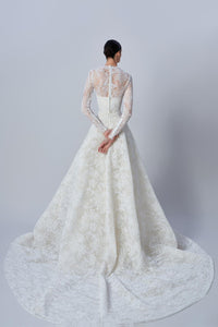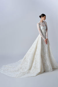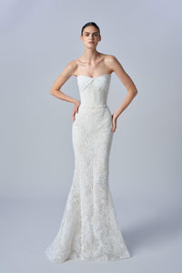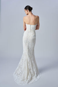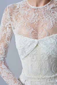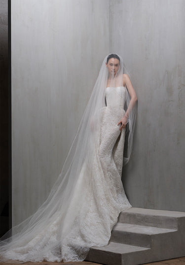 Look 2 captures the quiet allure of timeless craftsmanship. The dipped strapless Chantilly and guipure lace mermaid gown features intricate embroidery and a matching removable overskirt, creating a harmonious interplay of delicacy and contour.