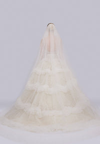 Look 13 captures the essence of enchanted elegance, where light dances across texture in a dreamlike silhouette. The fully embroidered ballerina gown is embellished with crystal stones, sequins, and gathered ruffled tulle, creating depth and radiance in every movement. An embroidered tulle veil and a headpiece adorned with crystals and pearls complete the look, adding a luminous finish to this fairytale-inspired composition.