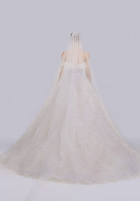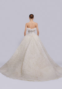 Look 3 is a dialogue between softness and sparkle, where timeless form is reimagined with playful contrast. The first look features a strapless Mikado pleated dress with a structured ruffle detail at the bodice, paired with a light tulle veil that softens its architectural silhouette. The second is a short strapless dress, fully embroidered with sequins and feathers, offering a radiant, textural counterpoint that evokes a spirit of lighthearted sophistication.