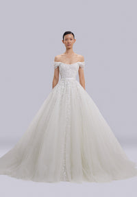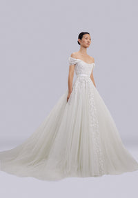 Look 6 evokes effortless romance, where softness and detail come together in a weightless silhouette. The off-the-shoulder embroidered tulle gown floats with delicate texture and graceful movement. An embroidered tulle veil completes the look, adding an airy layer of elegance to this timeless composition.