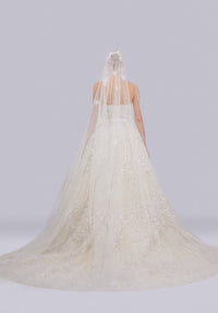 Look 8 radiates luminous elegance, where every detail is designed to shimmer with refined brilliance. The fully embroidered sweetheart ballgown is adorned with 3D organza flowers, sequins, crystal stones, and beads, creating a multidimensional, light-catching surface. An embroidered tulle veil completes the look, adding a soft, ethereal finish to this opulent silhouette.