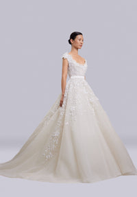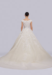 Look 9 captures romantic refinement, where intricate texture and soft structure meet in graceful balance. The off-the-shoulder embroidered gown is adorned with sequins and 3D organza flowers, creating a luminous, layered effect. An embroidered tulle veil completes the look, adding a delicate and airy touch to the elegant silhouette.