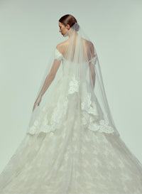Look 5 captures a delicate balance between structure and softness, where every thread traces a quiet rhythm. The off-the-shoulder ballgown features a sweetheart neckline and is crafted in silk thread lace with a floral motif arranged in a diamond pattern. A scalloped hem finishes the silhouette with refined grace—a gown suspended in timeless beauty and gentle movement. The look is complemented by a seamless tulle veil with comb, finished with handstitched flower guipure and a delicate lace eyelash trim along the edge.
