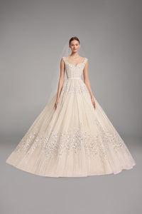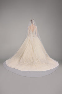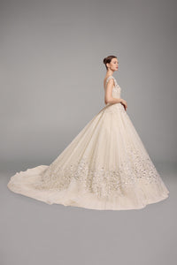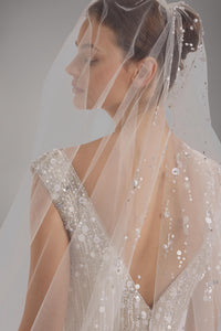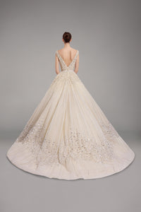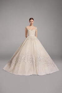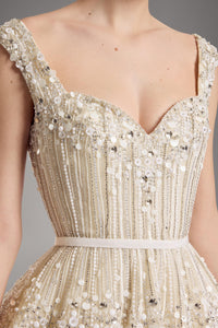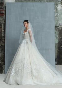Look 18 evokes a radiant sense of structure, where every line of light is drawn to shape and define. The off-the-shoulder ballgown features a sweetheart neckline and is fully embroidered with silver beads and sequins in a linear pattern, creating a shimmering, elongated silhouette. A Mikado belt at the waist adds sculptural definition to the gown’s voluminous form.