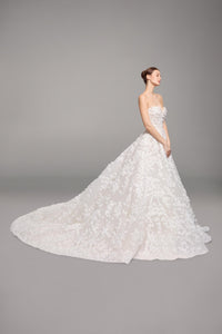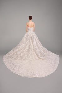 Look 2 brings the bride to life as a living sculpture, where form, texture, and bloom move as one. This sweetheart neckline gown is fully embroidered with yarn-embroidered flowers, adorned with 3D tulle and organza floral appliqués that build volume and depth—an elegant composition of contour and craftsmanship in motion.