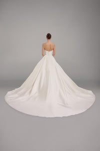 Look 5 evokes the essence of a bride as a living sculpture, where every curve and detail is shaped with intentional artistry. This strapless sweetheart silk Mikado gown features a sculpted bodice in guipure lace, embroidered with large leaf motifs and a touch of sequins that cascade onto the skirt, drawing the line of beauty through texture, movement, and light.