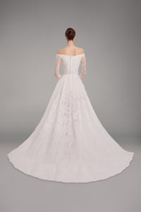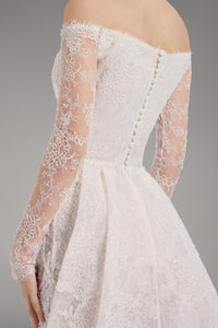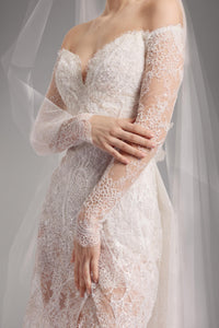 Look 6 evokes the quiet strength of classical form, where every curve and thread is drawn with intention and grace. The long-sleeved lace mermaid gown features a sweetheart neckline and a subtle front slit, embroidered with cord lace and yarn embroidery, delicately embellished with beads to enhance the gown’s textured silhouette and fluid movement.