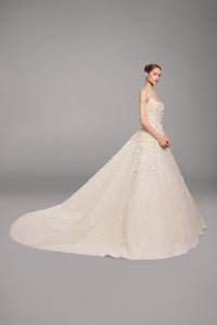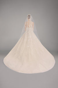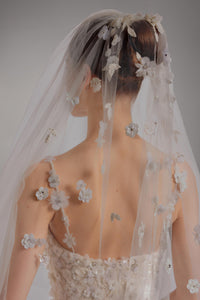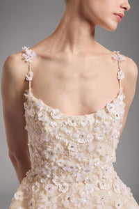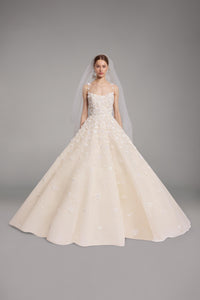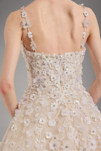 Look 8 evokes the delicate hand of an artist at work, where each bloom is sculpted from light, texture, and motion. The A-line tulle gown is embroidered with 3D feather flower appliqués and floral bouquets composed of beads and sequins, creating a layered composition that moves with luminous softness and refined dimension.