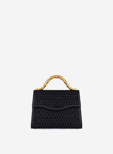 Timeless sophistication meets modern allure. This exquisite piece is crafted from the finest black raffia and adorned with a glistening gold bamboo-sculpted metal top handle. Expertly made in Italy, every detail reflects meticulous craftsmanship, effortlessly elevating any ensemble. This unique design can seamlessly transition from day to night with unparalleled elegance.