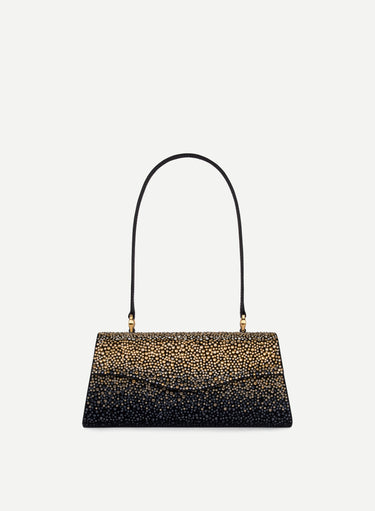 Timeless sophistication meets modern allure. This exquisite piece is crafted from the finest black embellished suede leather and adorned with gold to black ombre Swarovski crystals. Expertly made in Italy, every detail reflects meticulous craftsmanship, effortlessly elevating any ensemble. This unique design is the quintessential companion, making a statement at every occasion.