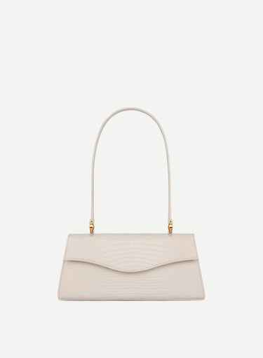Timeless sophistication meets modern allure. This exquisite piece is crafted from the finest lizard embossed cream leather. Expertly made in Italy, every detail reflects meticulous craftsmanship, effortlessly elevating any ensemble. This unique design can seamlessly transition from day to night with unparalleled elegance.