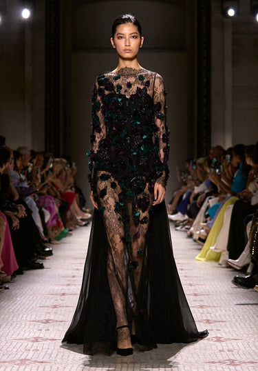 Look 10 evokes dark romance, like a haunting note in a moonlit serenade. The long fitted dress in black Chantilly lace features long sleeves and an open back. It is embroidered with 3D flowers and buds in lagoon blue and hortensia purple, creating a striking contrast. A long black chiffon silk train adds movement and a dramatic finish to the silhouette.