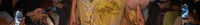 Look 9 blossoms with gilded warmth and feminine poise. The strapless gown in amber silk chiffon features a draped sweetheart neckline. Printed with multicolored florals, embellished with tone-on-tone sequins, and paired with a blush pink feather stole, the silk chiffon gown embodies romance in motion.