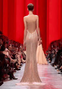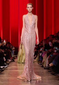 Look 29 conveys sultry refinement through sleek lines and radiant embellishment. The pencil dress in sunset silk tulle features a plunging neckline and open back, creating a striking yet elegant silhouette. Pearls and pink crystals are delicately embroidered throughout, lending soft shimmer and dimension.