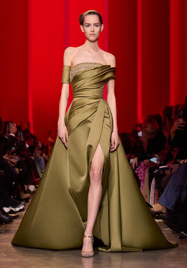 Look 49 channels refined vitality through sculpted lines and radiant accents. The off-the-shoulder sheath dress in linden green duchesse satin features a high slit and a sweeping train. The draped bust is adorned with foliage-inspired crystal and sequin embroidery, adding a touch of luminosity to the structured silhouette.