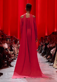 Look 57 channels the fiery spirit of Marrakesh’s midday light, where passion and elegance meet in striking harmony. The vermilion red crepe sheath dress features a long-sleeve, off-the-shoulder bodice with a soft draping effect that flows into a refined silhouette.