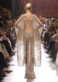 Long gold and silver mermaid gown featuring a plunging V-shaped neckline, refined torso cut-outs, a backless silhouette, twisted straps, and fluid cape sleeves.
