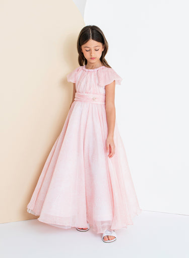 Light and flowing, this printed chiffon dress for kids in pink features a softly gathered silhouette and flutter sleeves that drape gently over the shoulders. A ruffled neckline and tonal waistband add a delicate finish, making it a charming choice for special occasions.