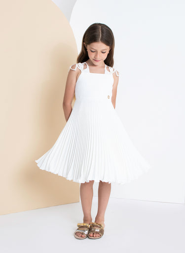 Graceful and fluid, this cream crepe dress for kids features a softly structured bodice and a finely pleated skirt that moves with every step. Decorative cut-out shoulder straps add a delicate, modern touch for special occasions.