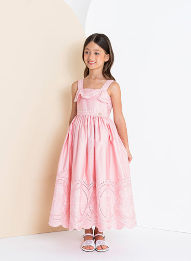 Soft and elegant, this pink embroidered dress for kids delights with a softly gathered skirt and delicate embroidery along the hem. A scalloped neckline and fine shoulder straps add a touch of whimsical charm, bringing gentle movement to every special occasion.