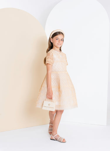 Timeless and elegant, this beige tulle dress for kids features intricate macramé and raffia-inspired embroidery throughout. Short sleeves and a gently flared silhouette lend subtle texture and refined charm.