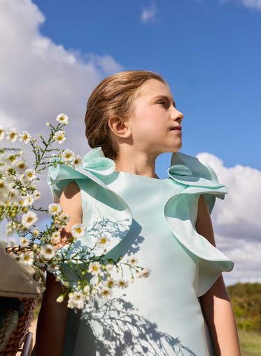 Graceful and flowing, this light blue mikado dress for kids features layered ruffled flutter sleeves and a gently flared silhouette. The smooth, structured fabric adds subtle volume and movement, making it a charming choice for special occasions.