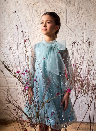 Shimmering and graceful, this light blue sequined tulle dress for kids glows with all-over embellishment and a softly tiered silhouette. Voluminous long sleeves and a sheer bow detail at the neckline add a touch of whimsical elegance, making it a standout choice for special occasions.
