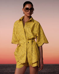 Finished with scalloped edges and swirl embroidery, this cotton shirt in Antique Yellow features a classic collar, buttoned front, and half sleeves. The cinched waist is defined with a complementary cotton belt, balancing structure with softness. Wear with matching pants for a coordinated daytime look.