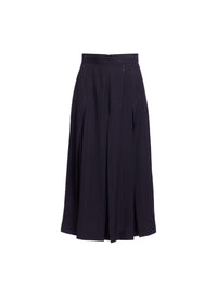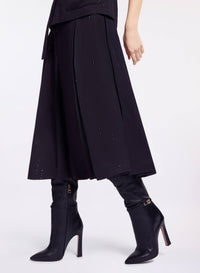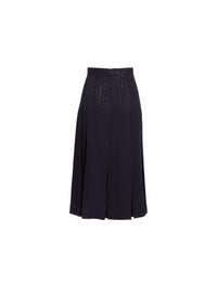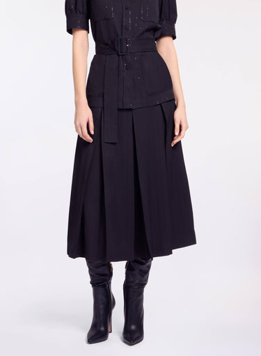 This black pinstripe skirt features a pleated, flared silhouette for a refined daywear look. Wear with the matching shirt for a sharp, coordinated ensemble.
