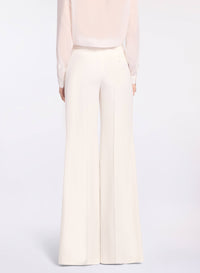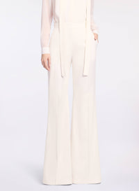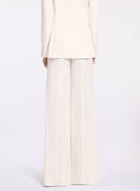 These white pinstripe pants are designed with a high-rise waist and flared silhouette, adding a tailored edge to daywear looks. Featuring front slash pockets, they pair perfectly with the matching jacket and shirt for a sharp, coordinated ensemble.