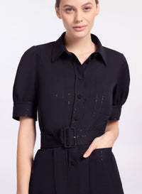 This black pinstripe shirt in crepe features a classic collar, buttoned front, and short puff sleeves. Designed with patch pockets and a belted waist, the black crepe shirt sculpts a flattering silhouette. Wear with the matching skirt for a polished daywear look.