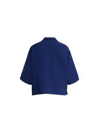 This blue oversized blouse reflects Elie Saab’s take on everyday elegance. Crafted in wool, it features golden monogram snap buttons on front patch pockets, a zip-up V-neckline, and bell-shaped 3/4 sleeves. Style the wool blouse with the matching flared pants for a coordinated look.