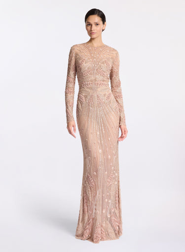This embroidered long dress in Sand Gazelle showcases Elie Saab’s signature precision and artisanal finesse. It features a round neckline, long sleeves, bead embroidery, silk lining, and a floor-length fit-and-flare silhouette. Pair this embroidered dress with Elie Saab’s leather platform sandals for a polished evening look.