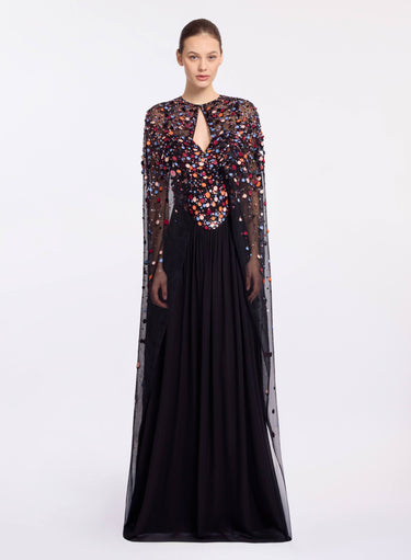 Sheer and shimmering, this floor-length black cape is embroidered with multicolored sequins for a luminous finish. The sequin-embroidered cape layers effortlessly over eveningwear, best worn with the matching dress for a coordinated, striking look.