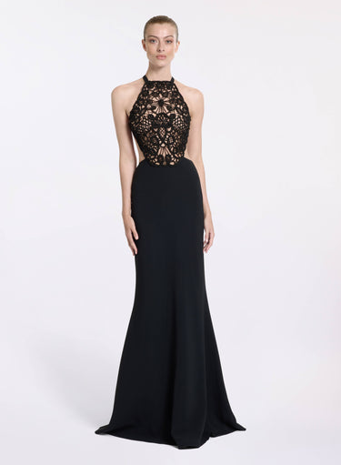 This black halter dress with beaded macramé embroidery draws inspiration from the elegance and romance of 1950s Italy. Crafted in viscose, it features a soft mermaid silhouette enhanced by a crepe cady skirt and an open-cross back. Style the black embroidered gown with Elie Saab’s leather platform sandals for an elegant look.