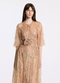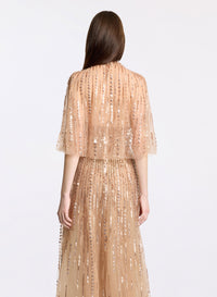 Cascading Cappuccino beige beads stream down this cropped sheer cape featuring a buttoned front closure and short cape sleeves. Wear with matching embroidered gown for a cinematic evening ensemble.