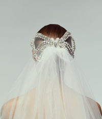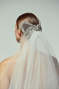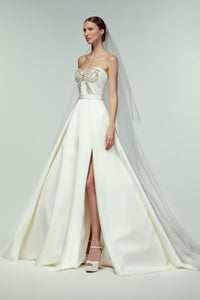 Look 10 highlights the purity of line and embellishment, where timeless structure is paired with delicate accents. The strapless sweetheart Mikado gown features an embroidered beaded bow at the bust and a row of buttons trailing down the back, blending sculptural simplicity with ornamental charm. A tulle veil with a soft blusher and a beaded headpiece shaped as a bow complete the look with graceful symmetry and a touch of sparkle.