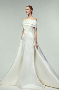 Look 11 merges sleek sophistication with fluid movement, creating a silhouette that is both structured and luminous. The strapless Mikado mermaid gown features a long train, buttons along the back, and removable shoulder draping that adds soft dimension to its clean lines. A beaded veil with a blusher completes the look, bringing a subtle shimmer that echoes the gown’s refined elegance.